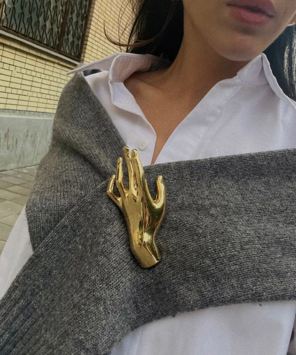 O acessório, popular até meados dos anos 60, ganhou status de “peça-desejo” depois de aparecer em editoriais internacionais. No street style, broches dourados e adornados por pérolas contrastam com paletas sóbrias típicas do outono.