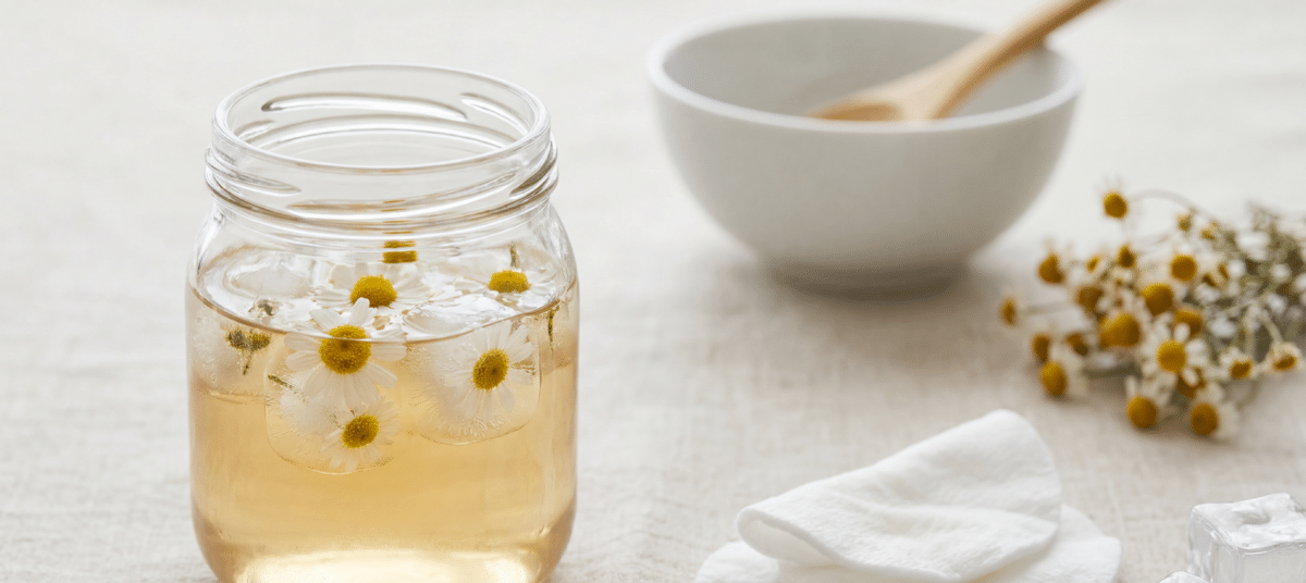 A camomila possui compostos anti-inflamatórios que reduzem vermelhidão e irritações, algo valioso para quem sofre com pele sensível. Quando o líquido vai à geladeira, a temperatura baixa provoca leve contração dos vasos sanguíneos e dos poros, deixando o rosto com aspecto mais liso e menos brilhante.