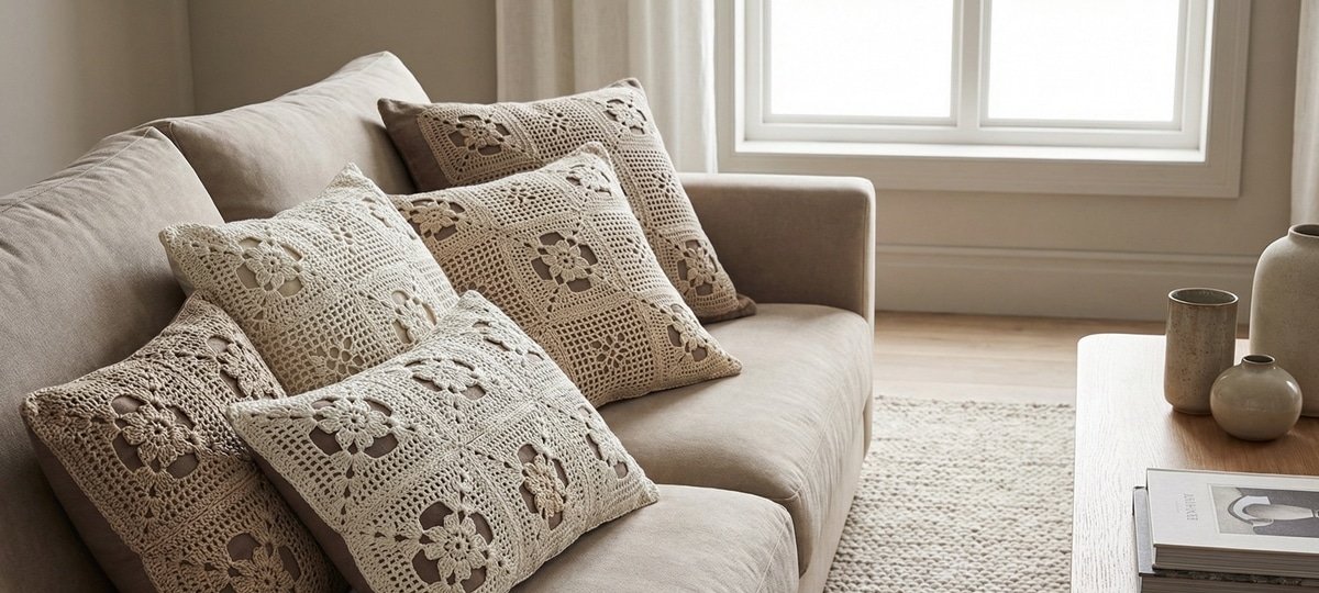 Eu acompanho de perto o movimento do design de interiores e me chamou a atenção como um item simples – a almofada de crochê com tecido – virou peça-chave na estética Hygge, focada em conforto e aconchego.