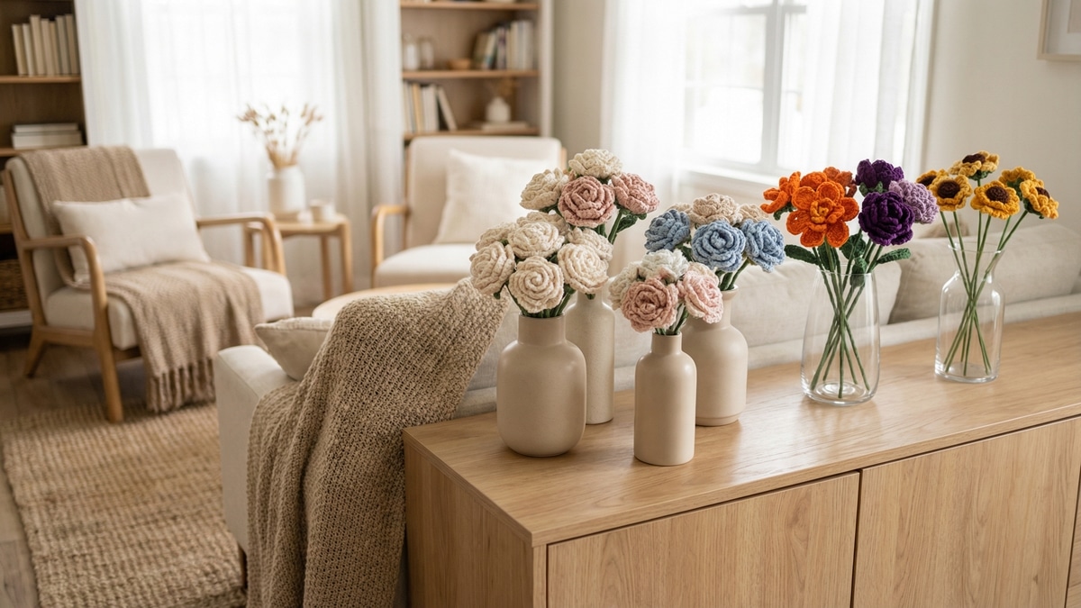 A liberdade cromática é o grande trunfo do crochê. Para salas neutras em bege ou cinza, tons vibrantes (amarelo, vermelho queimado) criam contraste e revitalizam o espaço. Se o cômodo já é colorido ou traz papel de parede estampado, arranjos monocromáticos ou pastel — lavanda, rosa bebê — mantêm harmonia sem poluir o visual.