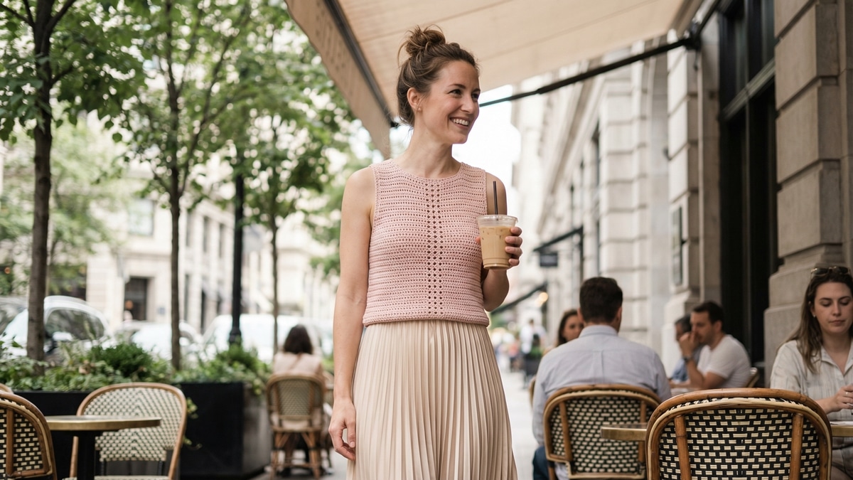 - Romantismo moderno – Versão pastel de ponto delicado encontra a saia midi plissada ou de cetim, unindo textura fosca e brilho suave.