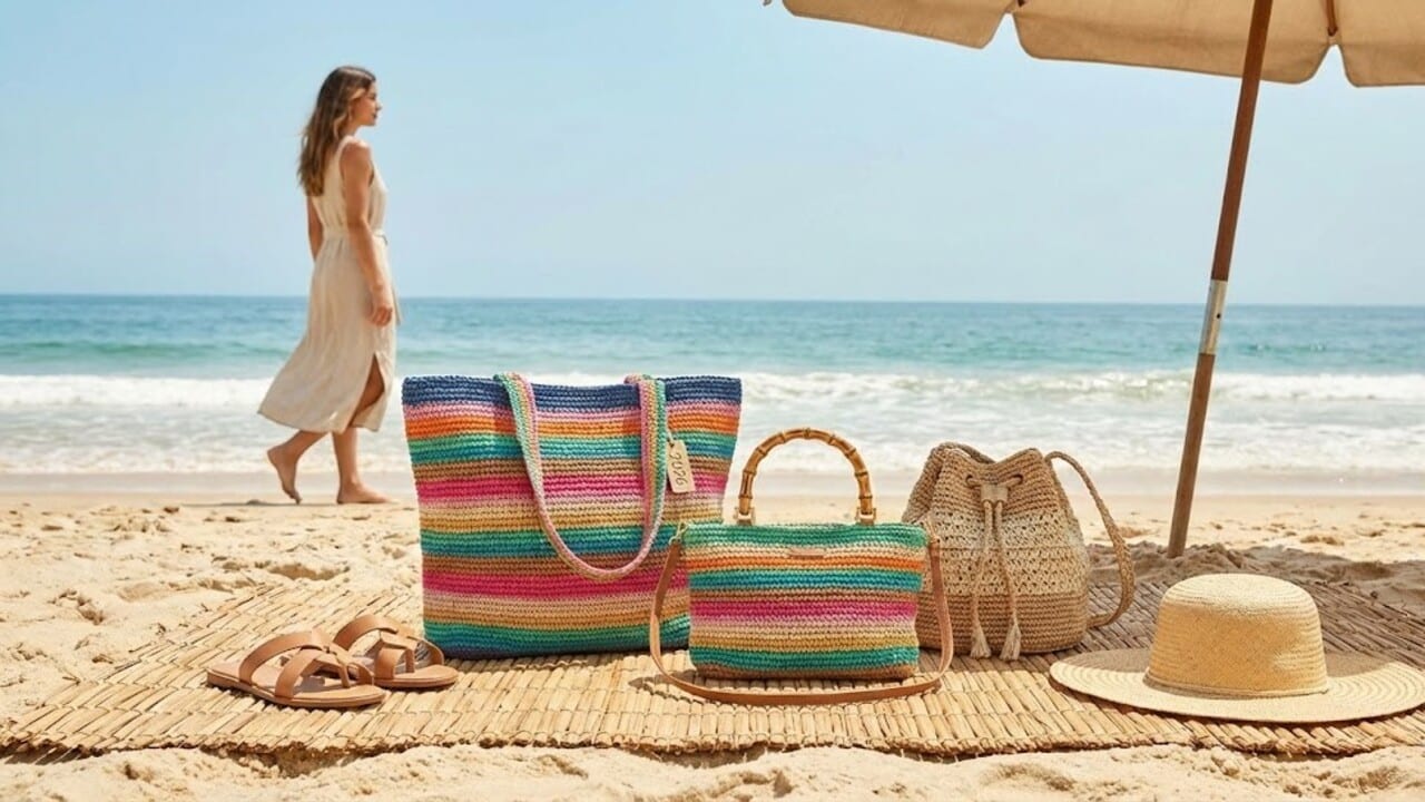 A textura artesanal conversa bem com roupas esvoaçantes. Sandálias de tiras finas e chapéus de palha reforçam o estilo relaxado, enquanto a bolsa assume o papel de destaque cromático ou tátil.