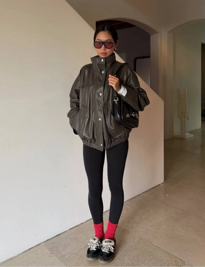 1. Mantenha proporção: peças de cima mais volumosas equilibram a modelagem justa da legging.