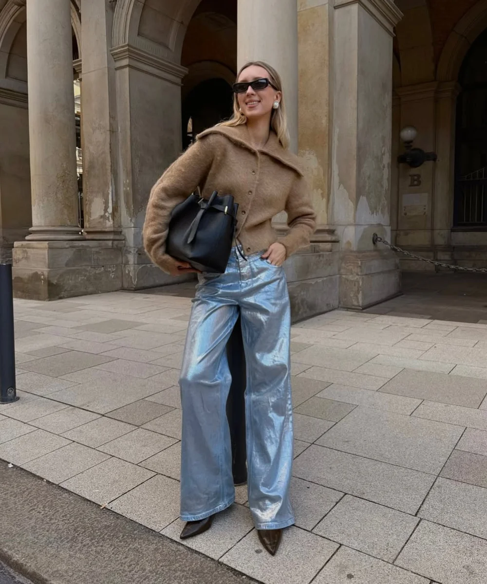 Durante a meia-estação, suéter oversized e botas de cano médio formam dupla imbatível com a calça resinada. Aposte em tricôs de gola alta para equilibrar texturas.