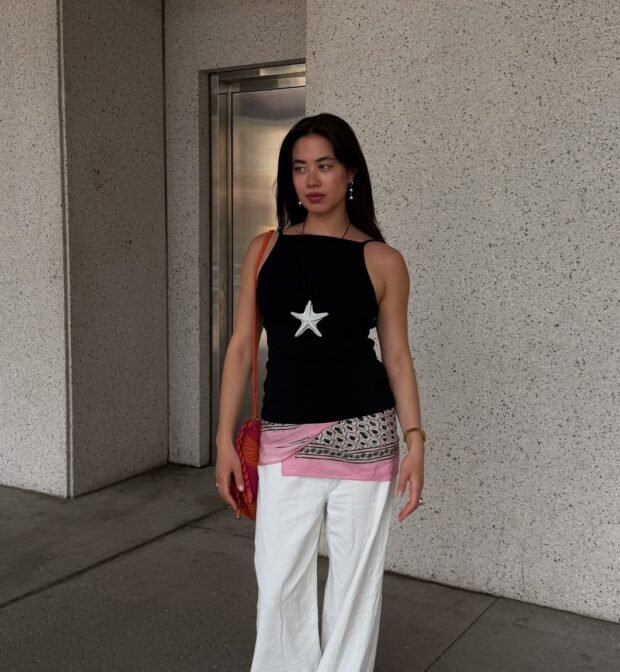 Amarrar um lenço colorido na cintura virou mania entre fashionistas. Sobre a base branca, o acessório vira ponto focal, injeta cor ou estampa e transforma um conjunto básico em produção de revista — efeito máximo com esforço mínimo.