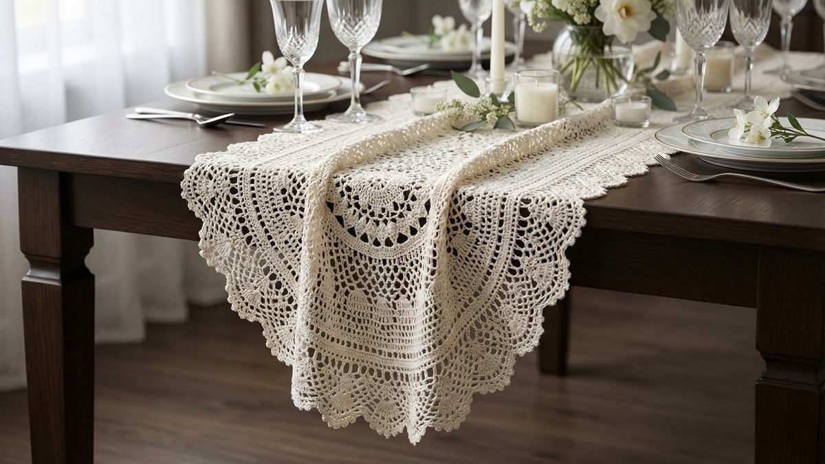 Colocado sobre toalha lisa ou direto na madeira, o caminho de mesa em crochê de luxo torna-se ponto focal imediato. Combine com louça branca, talheres clássicos e arranjos baixos para não ocultar o desenho rendado.