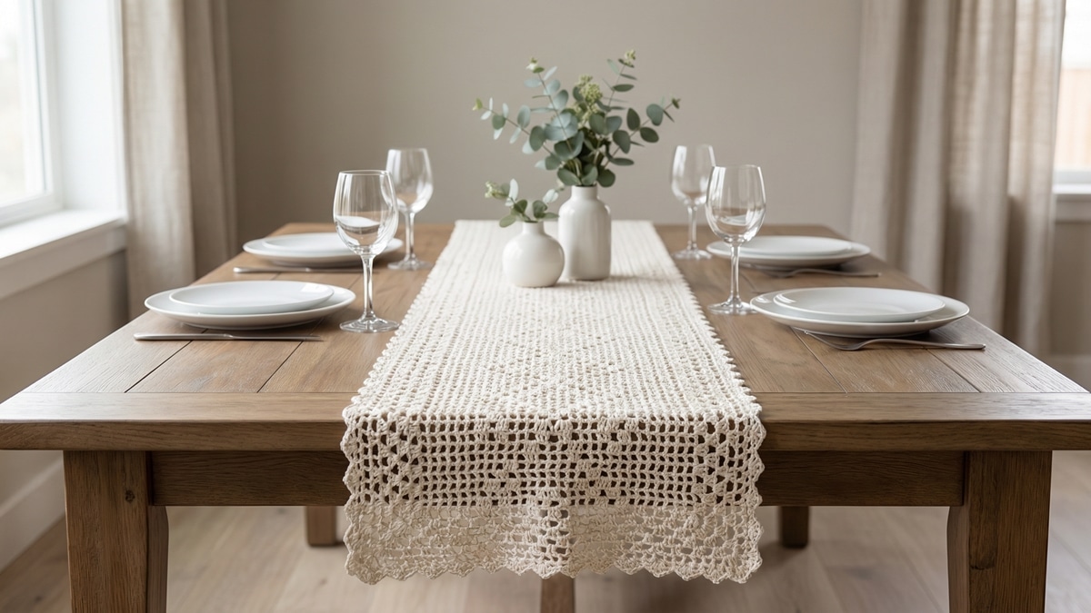 Eu acompanho tendências de interiores há anos e me chamou atenção como os caminhos de mesa em crochê voltaram aos holofotes, invadindo desde apartamentos compactos até grandes lugares de recepção.