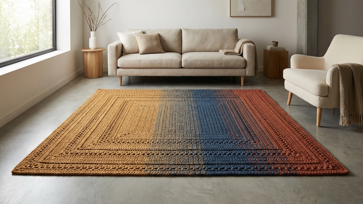 Um tapete feito à mão interfere diretamente na acústica e na “temperatura” visual do espaço. Ao trocar o barbante natural por tons vibrantes, degradês ou padrões gráficos, a peça passa de coadjuvante a protagonista. O segredo está na leitura do círculo cromático: