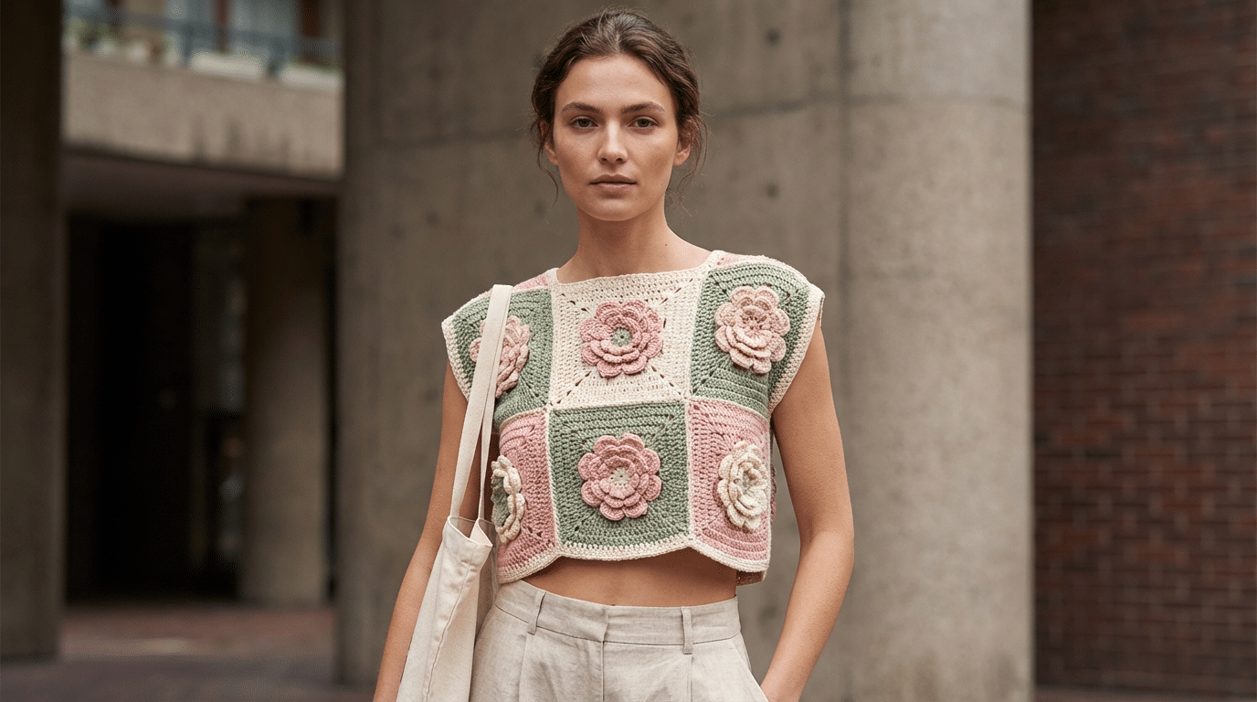 Eu acompanho de perto o avanço do vestuário artesanal e percebi o quanto o cropped de flores em crochê conquistou espaço nas últimas semanas. A peça, formada por quadrados com pétalas em relevo, reúne nostalgia e informação de moda de forma inédita.