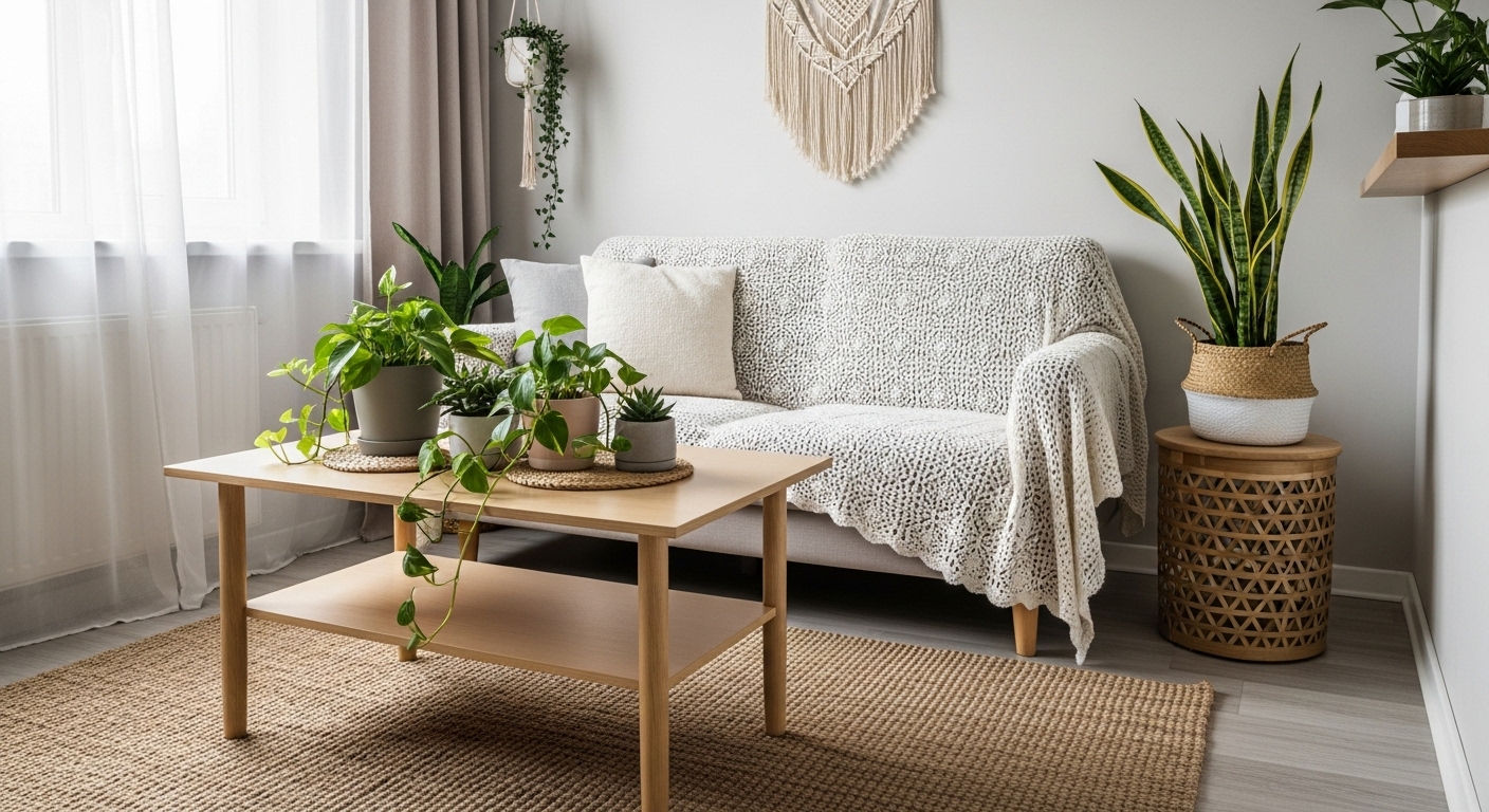 Suculentas, zamioculca e pothos (jiboia) são campeãs! Elas sobrevivem bem em meia-sombra e não ocupam muito espaço. Se quiser algo suspenso, aposte em samambaia-baby ou hera num suporte de macramê. Verde é vida, né?