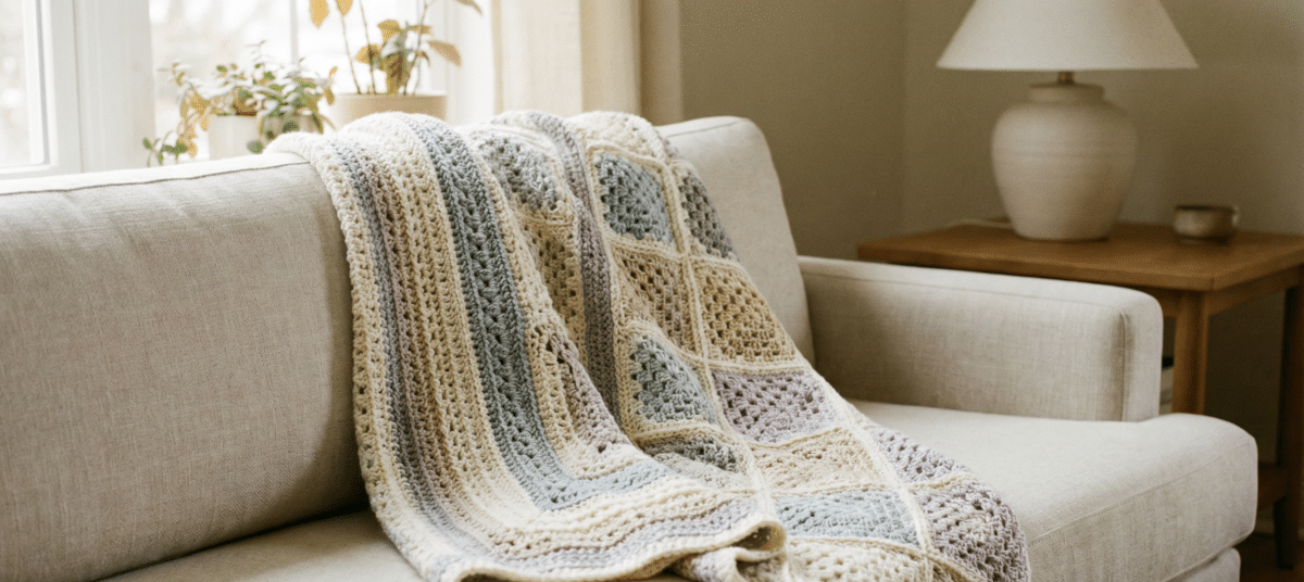 - Sofá o ano todo: pontos com respiro, como V ou granny, em fios médios. Medida comum: 1,20 m × 1,50 m.