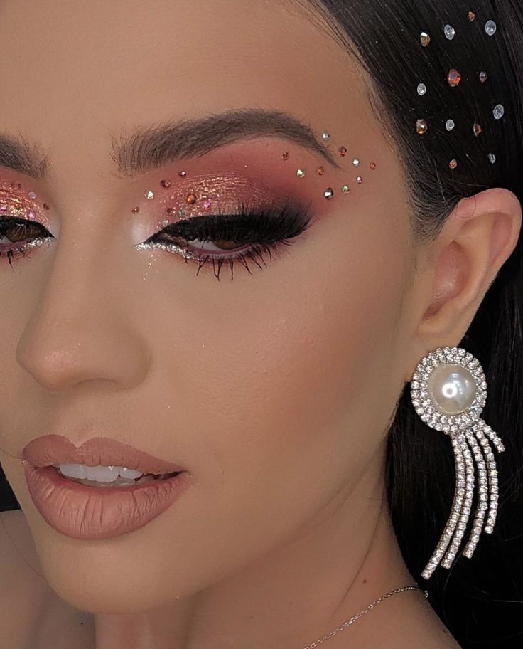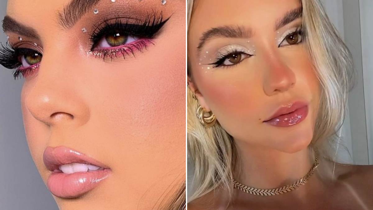 O glitter não desapareceu, mas mudou de papel. Em vez de cobrir grandes áreas do rosto, ele surge em pontos estratégicos.