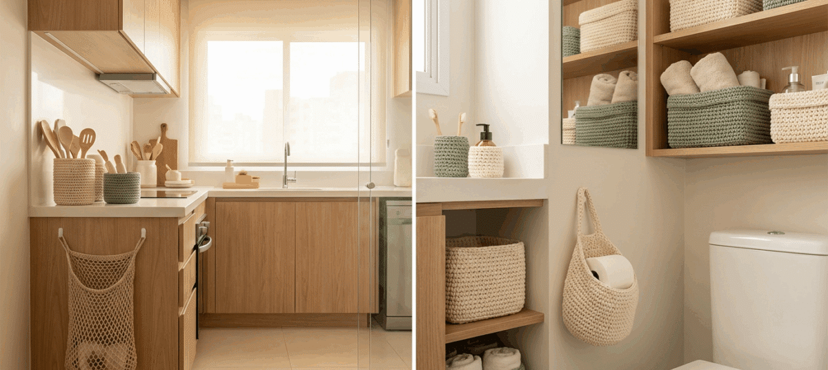 Frascos que se multiplicam na bancada, panos empilhados sem critério, potes jogados no armário: a cena é familiar em cozinhas e banheiros compactos. A boa notícia é que basta acrescentar algumas peças de crochê bem escolhidas para transformar o caos em praticidade — e ainda deixar tudo mais acolhedor.