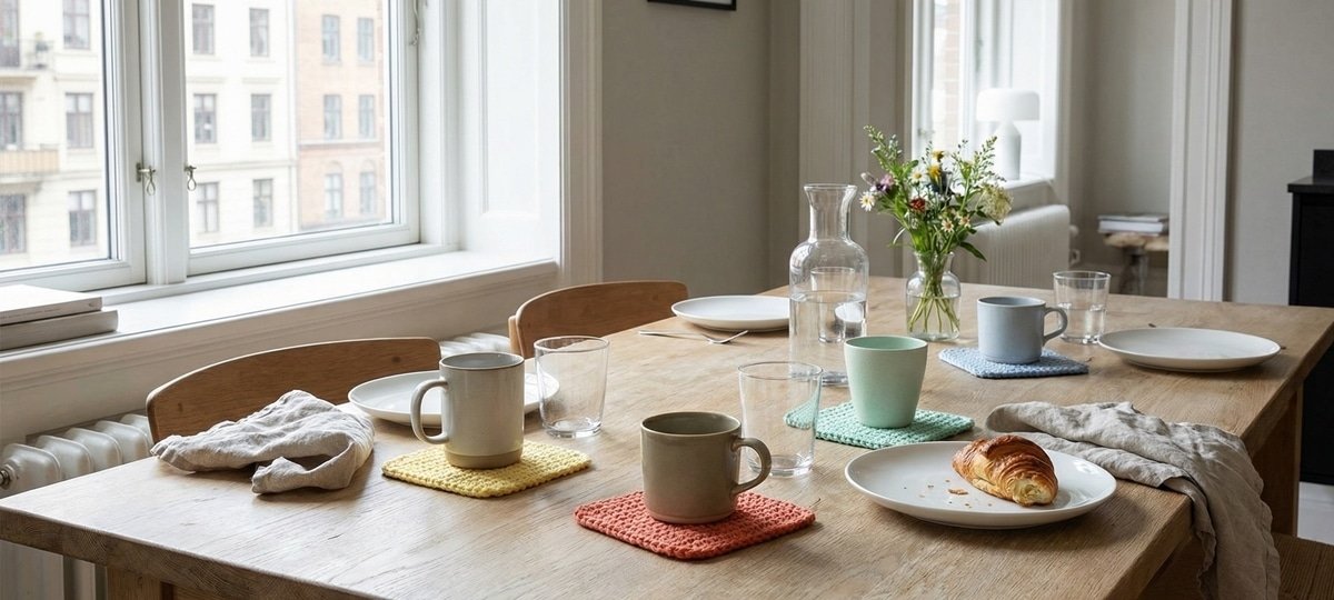 - Varie texturas: combine porta-copos de crochê com jogos americanos de linho ou sousplats de madeira.