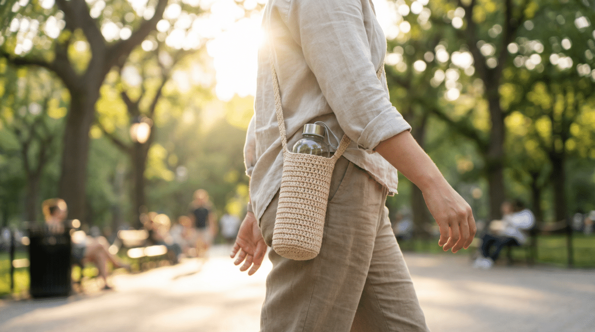 Eu observo de perto as tendências de verão e me chamou atenção a quantidade de pessoas batendo perna com garrafas penduradas em suportes de crochê. A cena resume bem a febre do porta-garrafa feito à mão, item que une hidratação, conforto e responsabilidade ambiental.