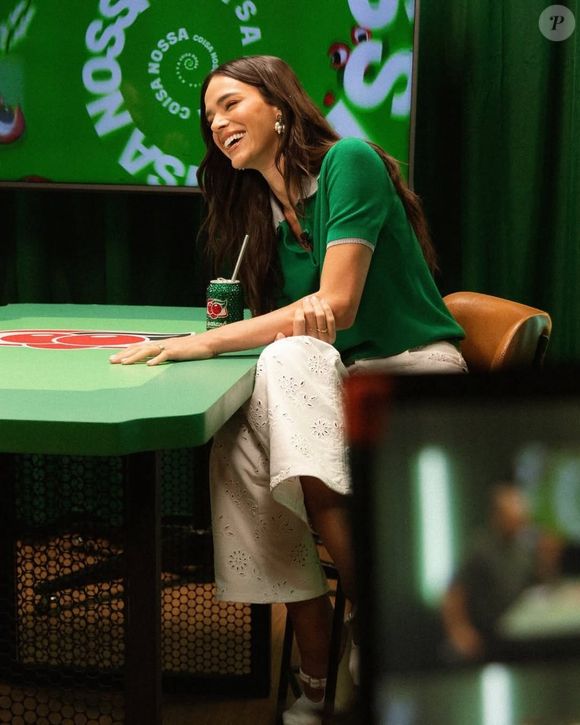 Bruna ajustou cada peça ao cenário verde-e-branco da marca de refrigerante. A silhueta descontraída, porém luxuosa, equilibrou referências nostálgicas com toques esportivos, criando um visual harmonioso do começo ao fim da gravação.