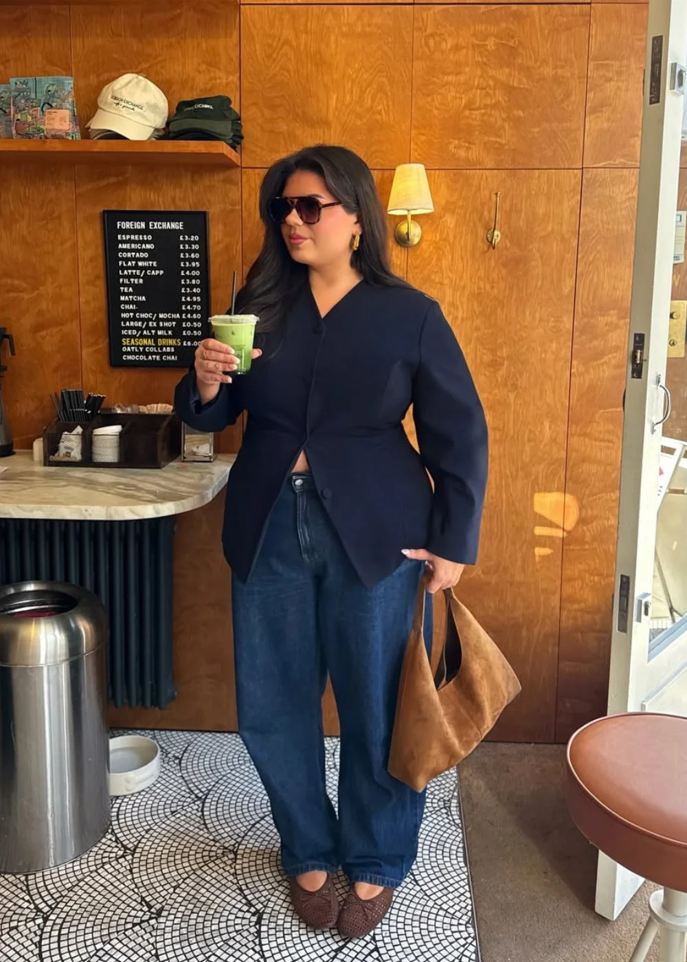 A dupla jeans escuro e sobretudo de lã ganha leveza com uma flat clássica. Ideal para quem anda muito pela cidade.