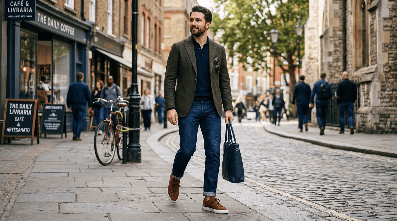 Num cenário de consumo mais consciente, um único par de tênis de camurça marrom atende a diversas lavagens de jeans e ainda combina com calças chino ou sarja. Resultado: menos peças, mais combinações.