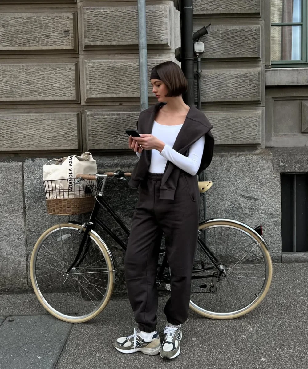 - Conjunto de moletom marrom + blusa branca: perfeito para dias frios; acessórios retrô arrematam.