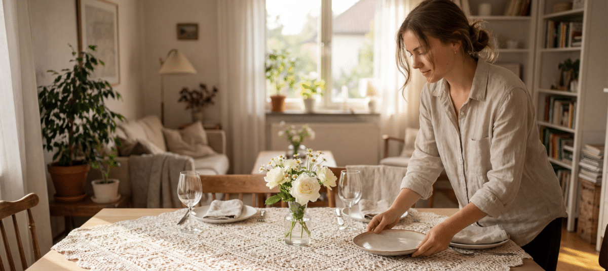 Eu acompanho o mercado de decoração e fiquei surpresa ao ver como as toalhas de mesa em crochê voltaram a dominar projetos de interiores. A peça, feita à mão, vem ganhando espaço por transformar qualquer refeição simples em momento acolhedor, como mostra a imagem de uma mulher arrumando a mesa com um modelo claro em ambiente aconchegante.