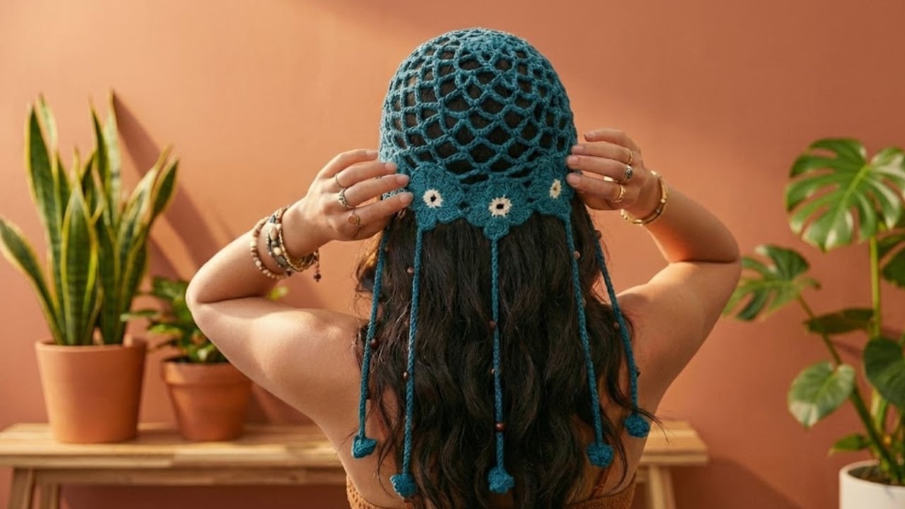 A touca cigana de crochê reforça que a moda feita à mão não sai de cena; ela apenas se reinventa, agora dominando cabeças que buscam autenticidade e personalidade.