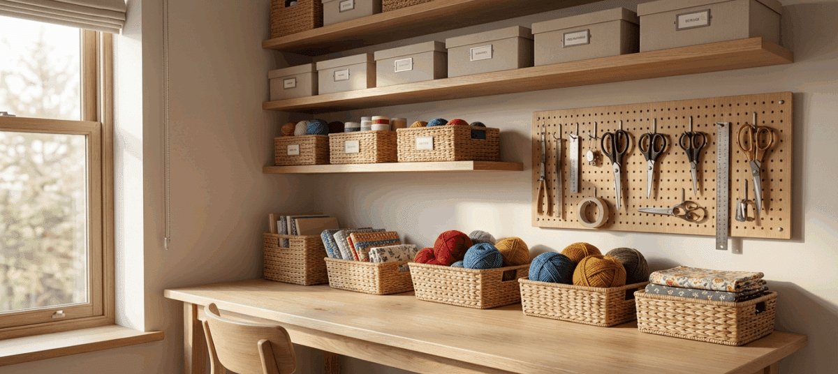 - Prateleiras estreitas mantêm potes de linhas, tintas e retalhos à vista.