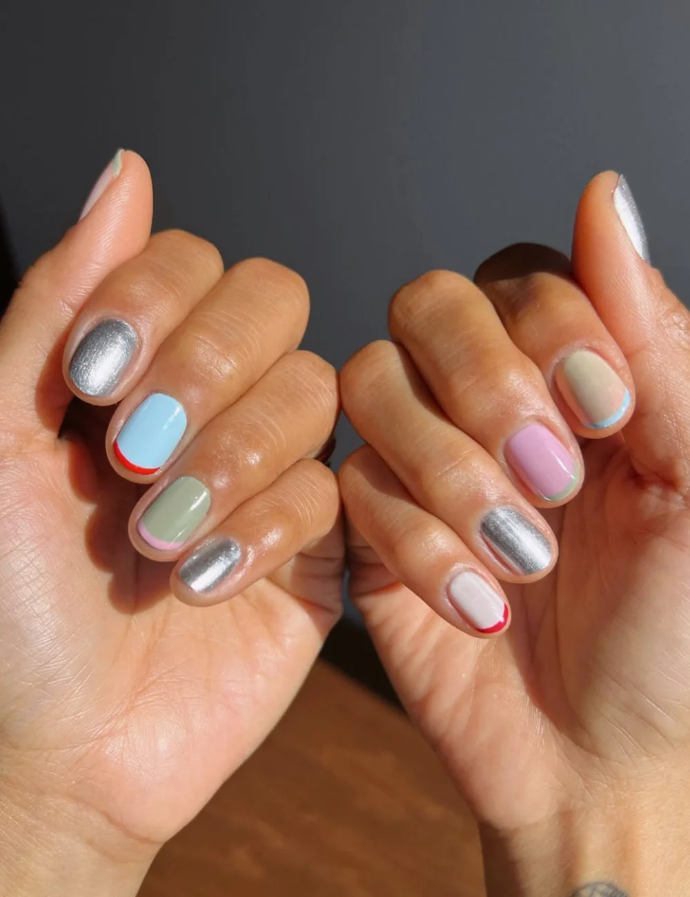 O cromado prateado contrasta com pontas em tons vibrantes, unindo delicadeza e modernidade na medida certa.