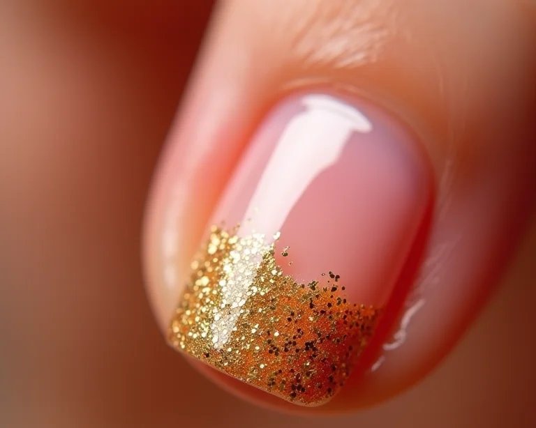 - Quando a cor estiver quase seca, use um pincel fino para aplicar glitter somente na extremidade livre da unha.