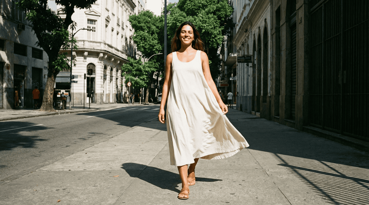 Vestido regata é o nome que desponta nas buscas sempre que o termômetro sobe. Graças ao corte simples, sem mangas volumosas e sem golas altas, a peça reduz pontos de atrito na pele e garante circulação de ar, algo essencial em cidades cada vez mais quentes.