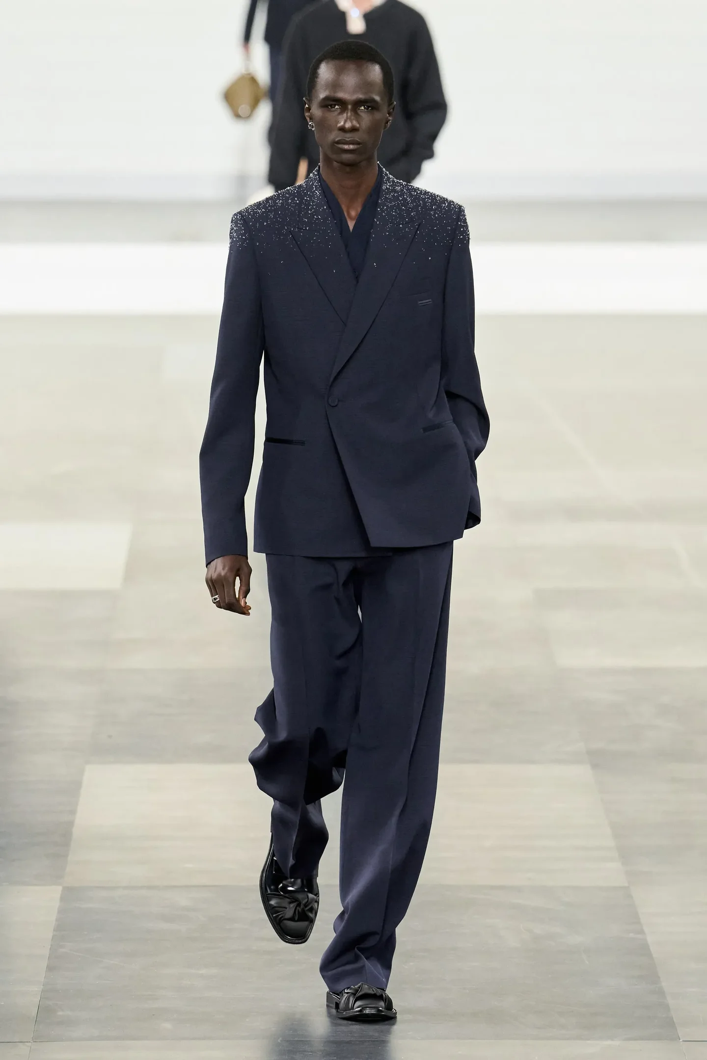 • Dior – Na última quarta-feira (21), Moura sentou na fila A do desfile masculino da grife, levantando a suspeita de que usará algo da maison. Um paletó preto da coleção inverno 2025, marcado por pontos brilhantes nos ombros, reuniria tradição e ousadia na medida.